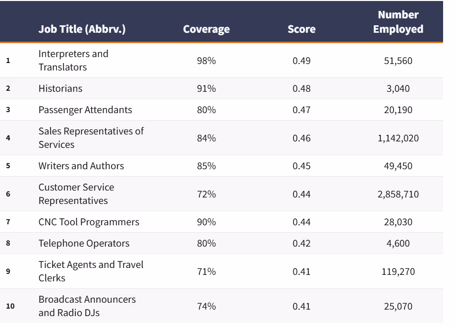 Which jobs are feeling the most heat? The Microsoft study actually ranked 80 occupations by AI’s impact. The top ten most threatened roles include some eye-openers: Interpreters and translators earned the unlucky No. 1 spot, with historians, technical writers, and authors not far behind. Sales representatives and customer service agents also made the list of jobs already seeing heavy AI penetration. In plainer terms: if your work revolves around processing information or communicating in predictable ways, an AI can probably learn to do it. A translator turning text from English to Spanish? That’s squarely in AI’s wheelhouse now. A travel agent re-booking your flight? An algorithm can handle that (and likely did, if you’ve used an airline’s app lately).